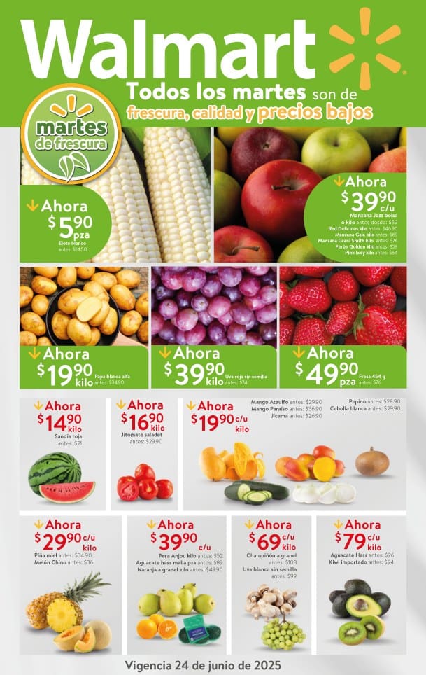 El Martes de Frescura Walmart este 24 de junio de 2025 tendrá preparadas las siguientes ofertas de frutas y verduras que aplican en tiendas Walmart y Walmart Express de la República Mexicana. Te comparto la lista completa de precios que puedes aprovechar esta semana.