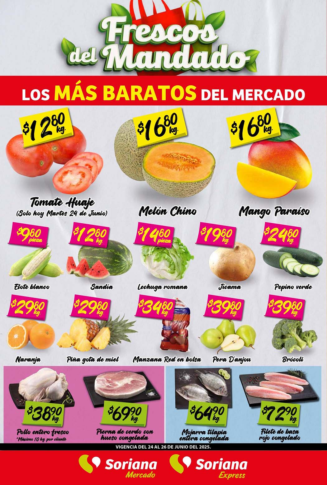 Ya tenemos el Folleto Los Frescos del Mandado de Soriana Mercado y Express con las siguientes ofertas en frutas y verduras válidas del 24 al 26 de junio de 2025, donde encontraras descuentos y precios especiales toda la semana.