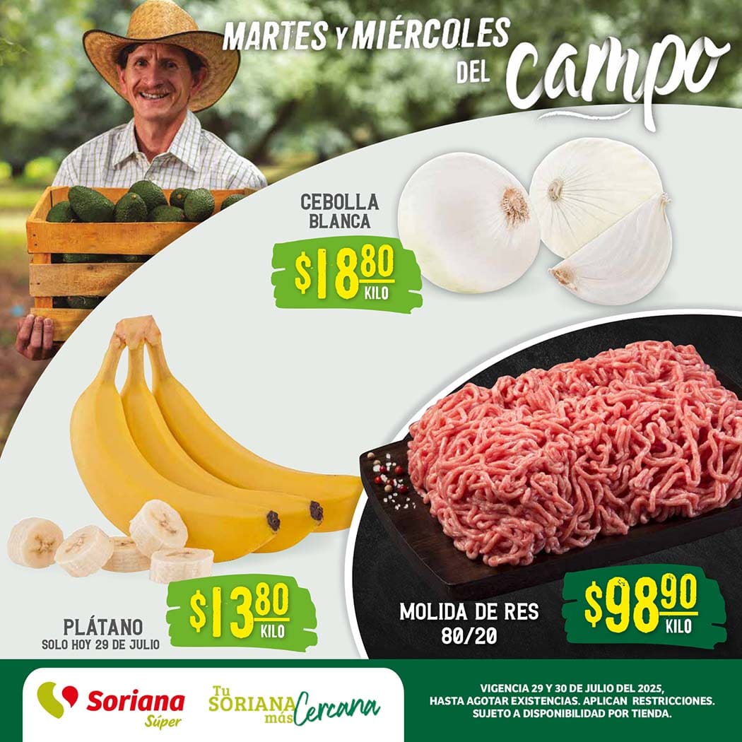 Soriana Súper en su Martes y Miércoles del Campo tiene preparadas las siguientes ofertas en carnes, frutas y verduras válidas los días 29 y 30 de julio de 2025, en el que encontrarás precios especiales en sucursales participantes toda la semana. Te comparto la lista completa de precios para que surtas tu despensa y ahorres varios pesos.