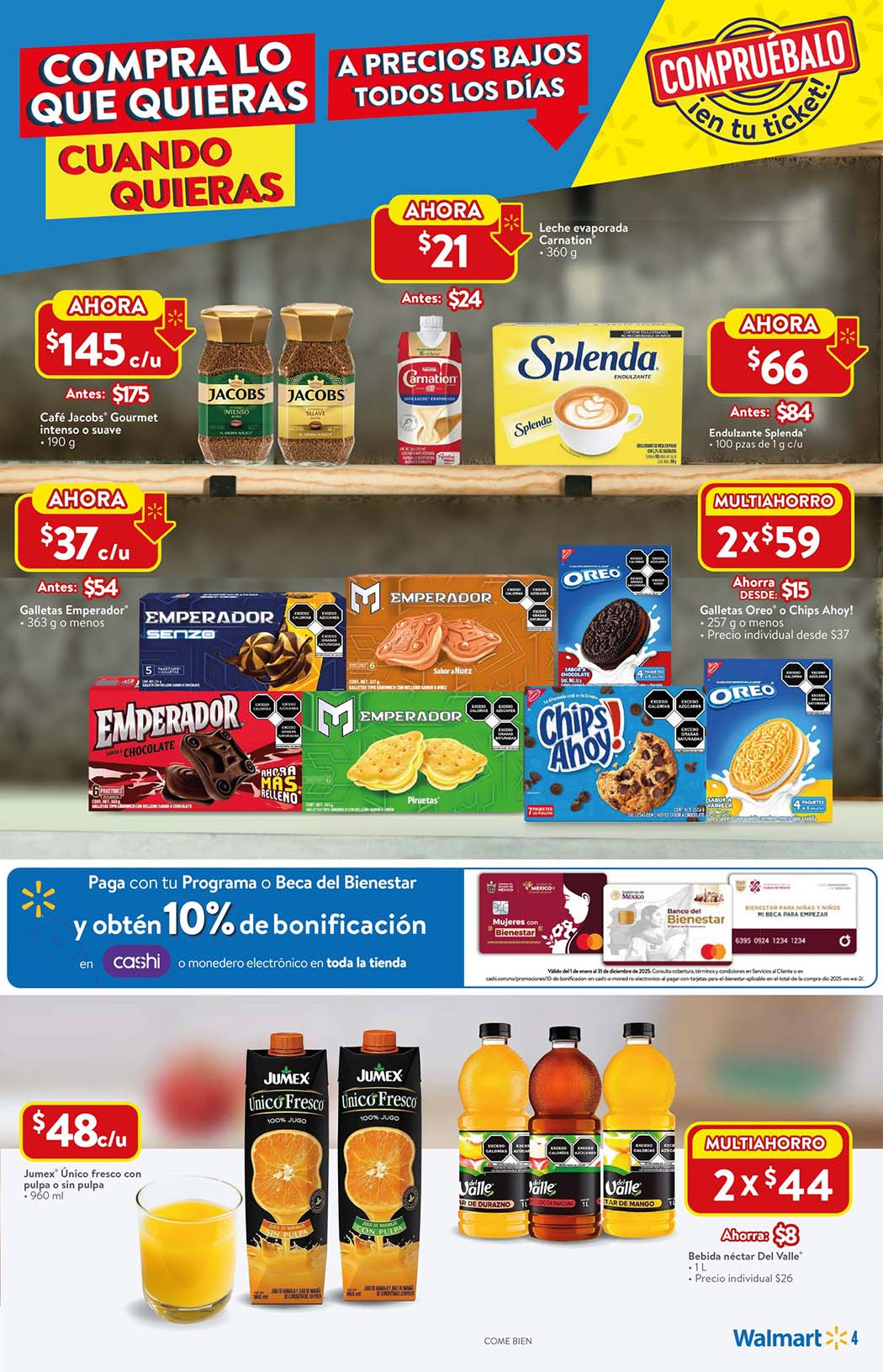 Les comparto el folleto de Walmart Precios Bajos todos los Días, Compra lo que Quieras Cuando Quieras válido del 24 de julio al 13 de agosto de 2025, en el que encontrarás Ofertas, Precios Bajos, Multiahorros, Rebajas, Bonificación en Cashi o Monedero electrónico si pagas con tu Programa o Beca del Bienestar y Bonificaciones con Cashi que aplican en productos seleccionados.