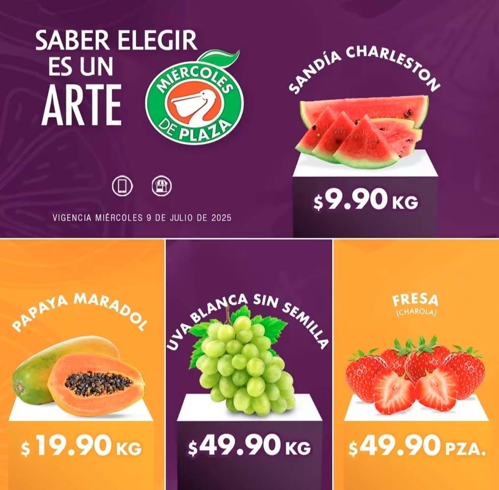 El Miércoles de Plaza de La Comer 9 de julio de 2025 presenta las siguientes ofertas en frutas y verduras que aplican en tiendas La Comer y Fresko. Además puedes hacer tus pedido a través de su tienda en línea lacomer.com.mx. Aprovecha de precios especiales que aplican en sucursales participantes de toda la Republica Mexicana.