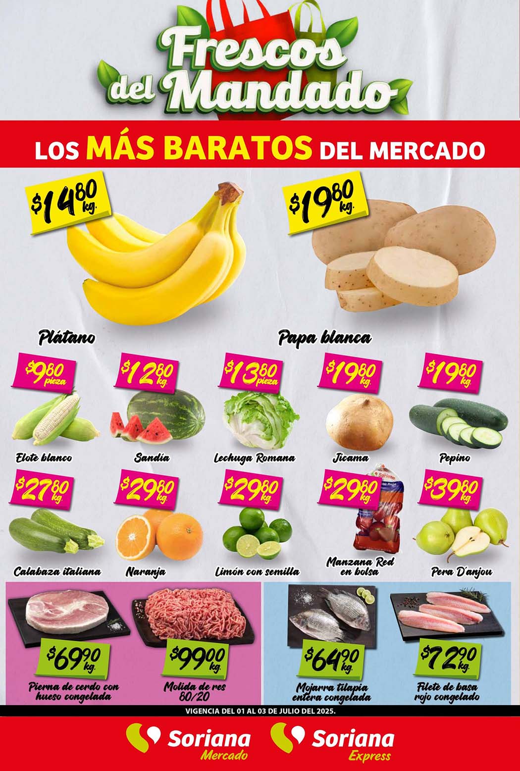 Ya salio el Folleto Los Frescos del Mandado de Soriana Mercado y Express con las siguientes ofertas en frutas y verduras válidas del 1 al 3 de julio 2025, donde encontraras descuentos y precios especiales toda la semana.