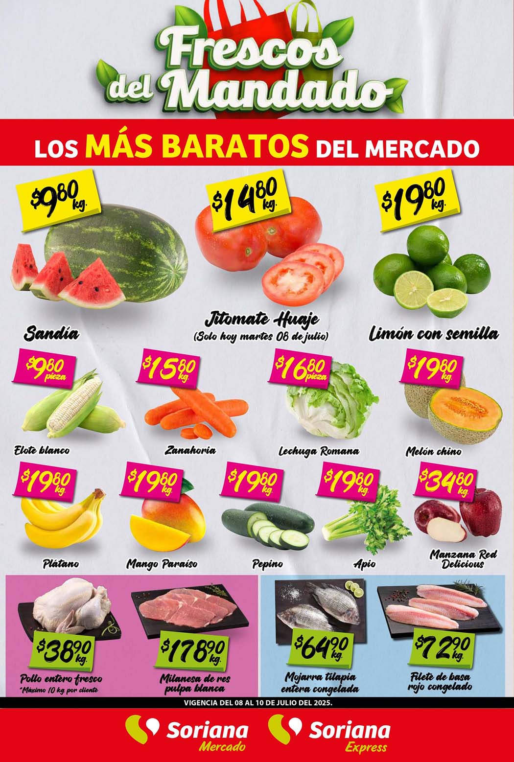 Les comparto el Folleto Los Frescos del Mandado de Soriana Mercado y Express con las siguientes ofertas en frutas y verduras válidas del 8 al 10 de julio 2025, donde encontraras descuentos y precios especiales toda la semana.