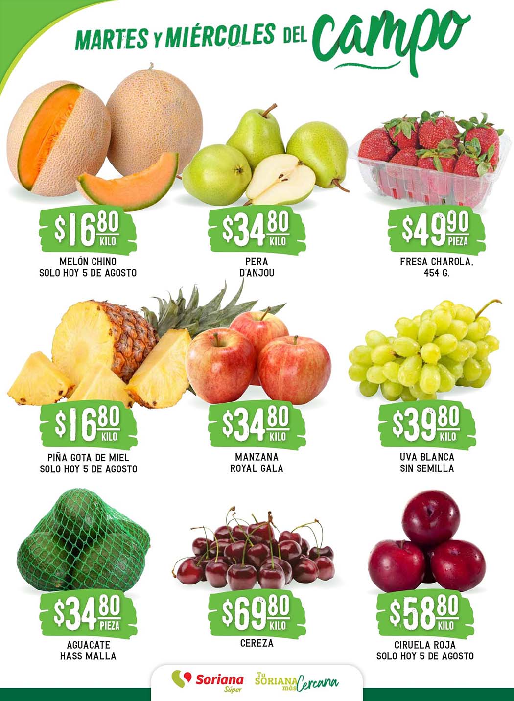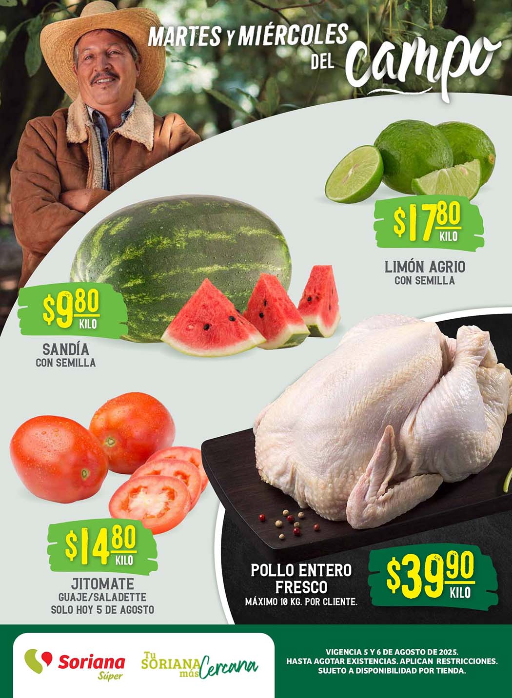 Las tiendas Soriana Súper en su Martes y Miércoles del Campo presentan las siguientes ofertas en carnes, frutas y verduras válidas los días 5 y 6 de agosto de 2025, en el que encontrarás precios especiales en sucursales participantes toda la semana. Te comparto la lista completa de precios para que surtas tu despensa y ahorres varios pesos.