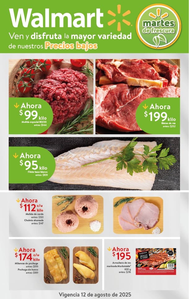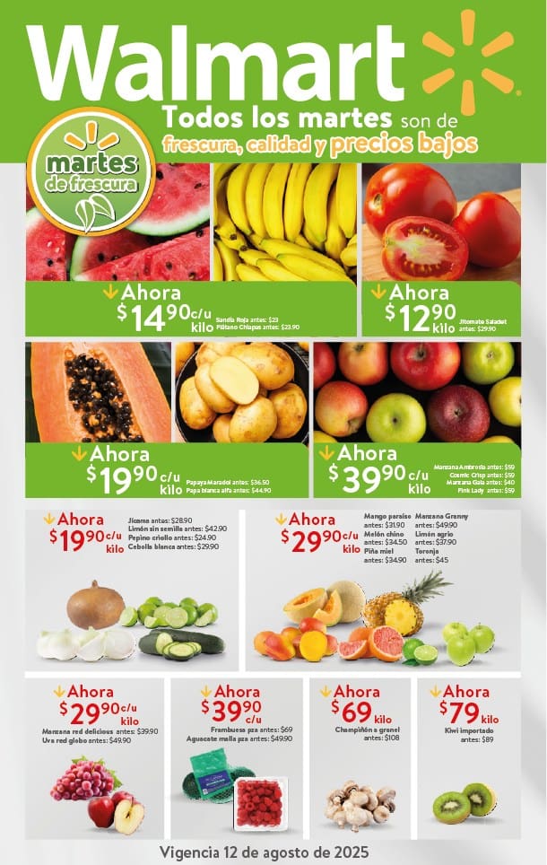 El Martes de Frescura Walmart de esta semana presenta las siguientes ofertas de frutas y verduras válidas el día 12 de agosto de 2025 que aplican en tiendas Walmart y Walmart Express de la República Mexicana. Te comparto la lista completa de precios que puedes aprovechar esta semana.