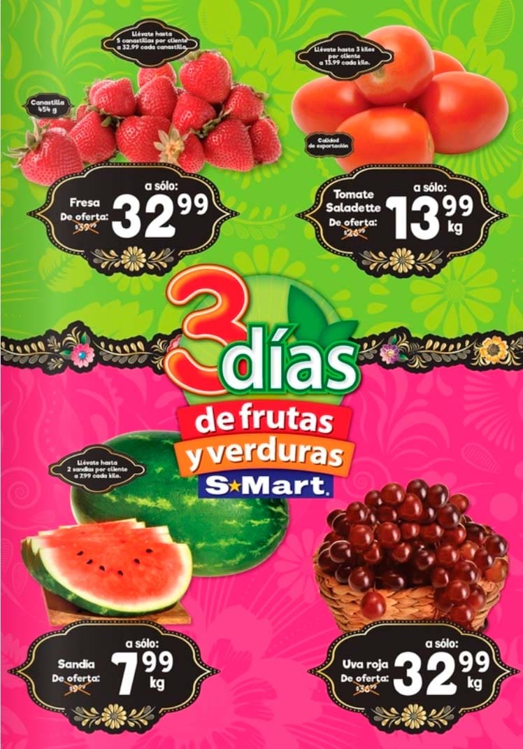 Ya tenemos el folleto de S-Mart con las ofertas “3 Días de Frutas y Verduras” válidas del 19 al 21 de agosto 2025, en el que encontrarás precios especiales que puedes aprovechar para surtir tu despensa esta semana, te comparto la lista de precios.