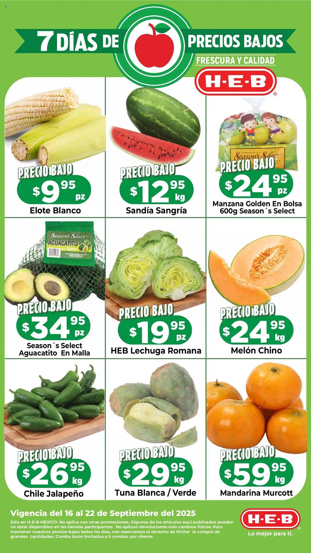 Les comparto el folleto “7 Días de Precios Bajos” de tiendas HEB con las siguientes ofertas de frutas y verduras válidas del 16 al 22 de septiembre 2025, en el que encontrarás promociones especiales en sucursales participantes de la República Mexicana.