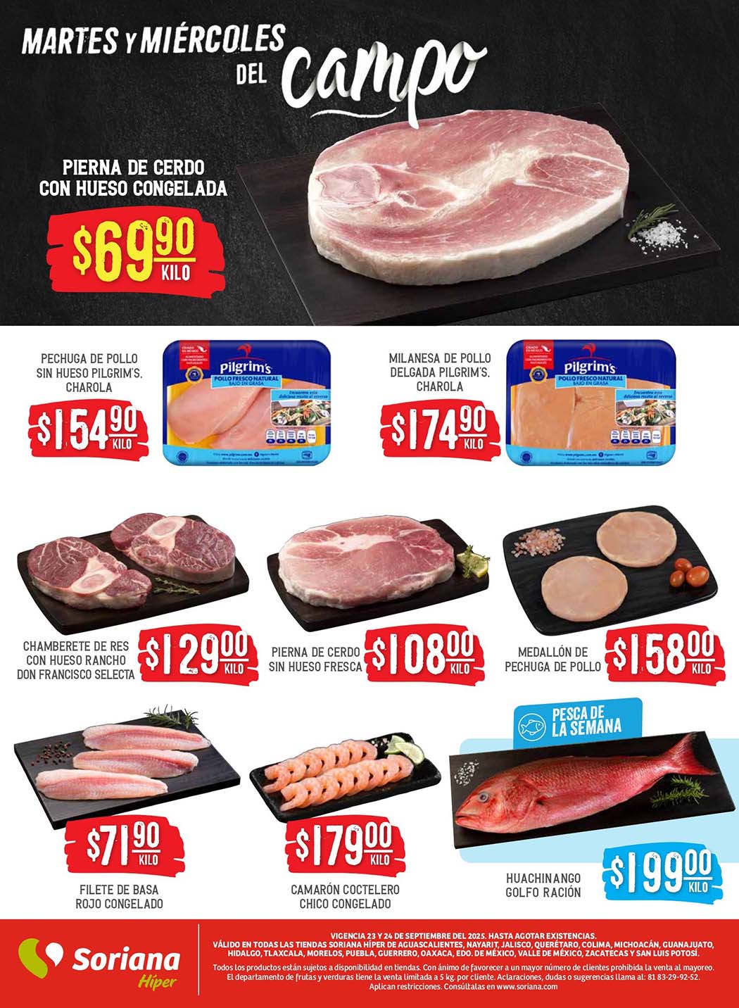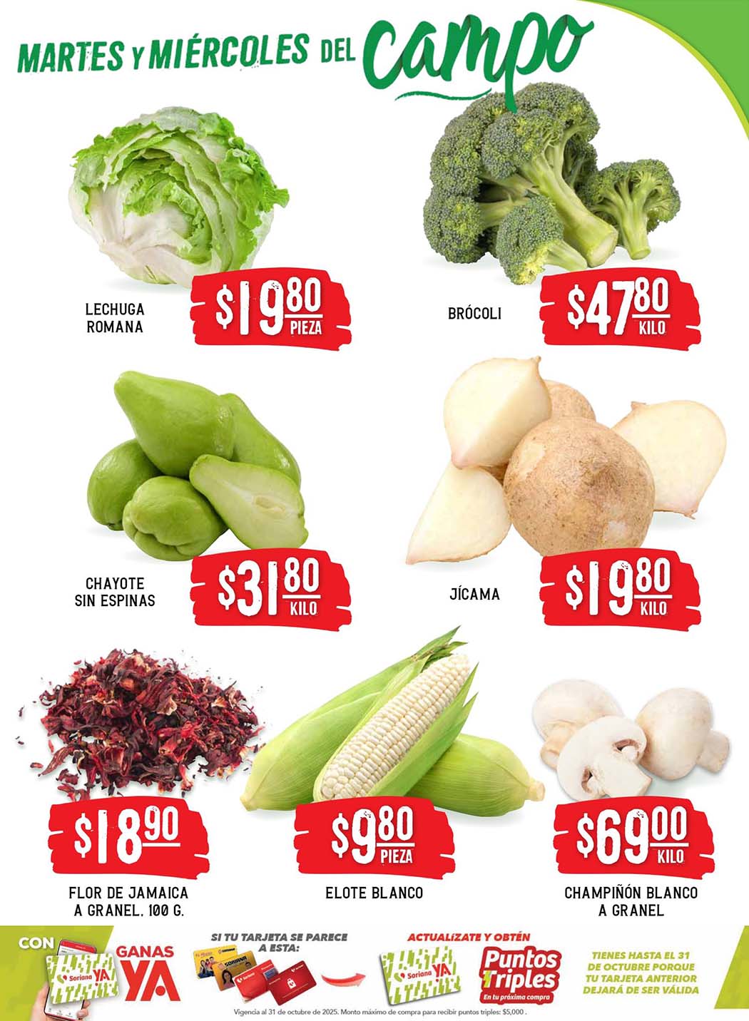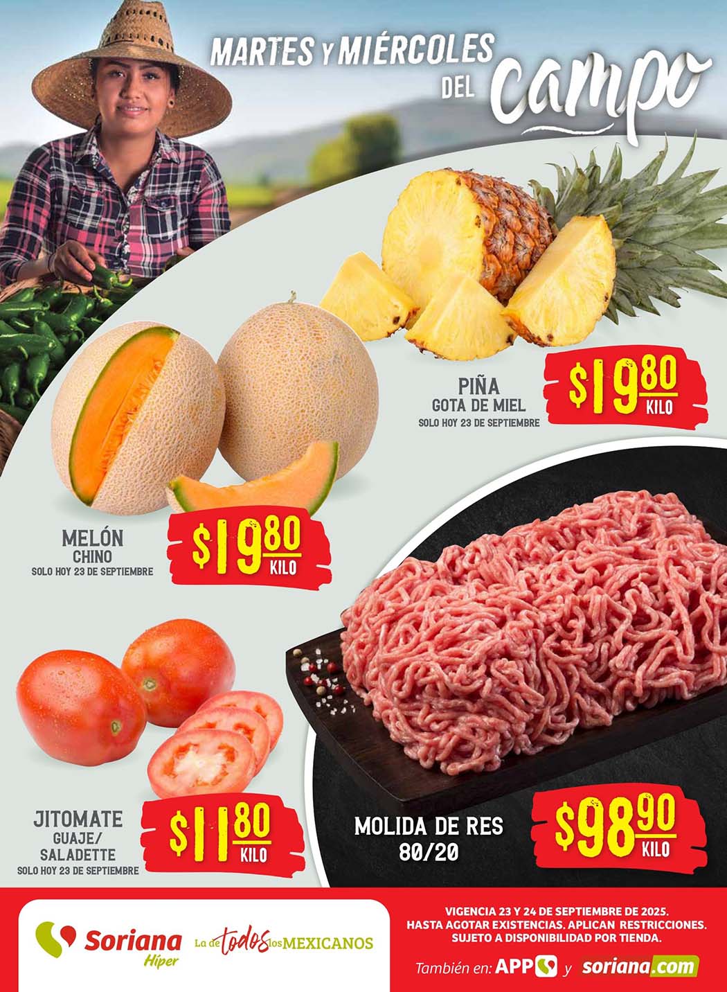 Las tiendas Soriana y su Martes y Miércoles del Campo tendrán las siguientes ofertas de frutas y verduras válidas los días 23 y 24 de septiembre 2025 que aplican en tiendas Soriana Híper participantes de la República Mexicana. Te comparto la lista de precios, para que compares y ahorres varios pesos por tus compras.