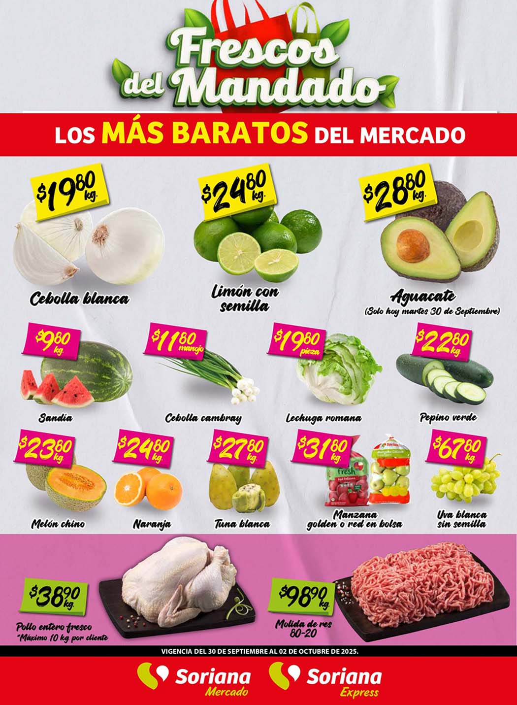 Les comparto el Folleto de Soriana Mercado y Express Los Frescos del Mandado con las siguientes ofertas en frutas y verduras válidas del 30 de septiembre al 2 de octubre 2025, donde encontraras descuentos y precios especiales toda la semana.