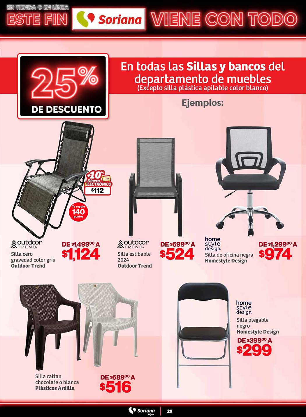 - 25% de descuento en Todas las Sillas y Bancos del departamento de muebles (excepto silla plástica apilable color blanco)