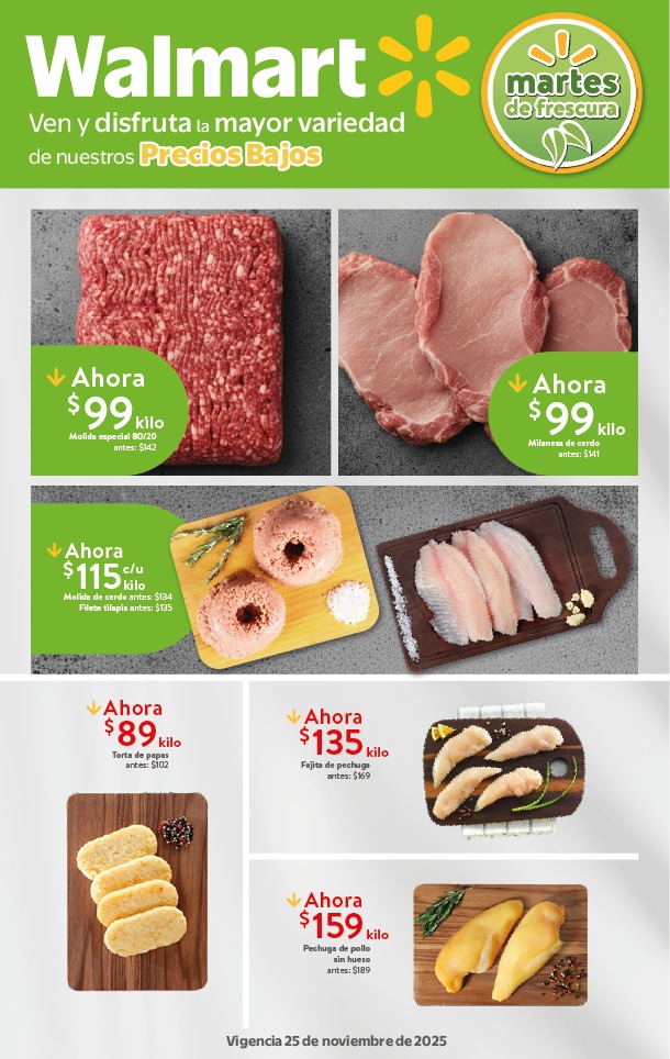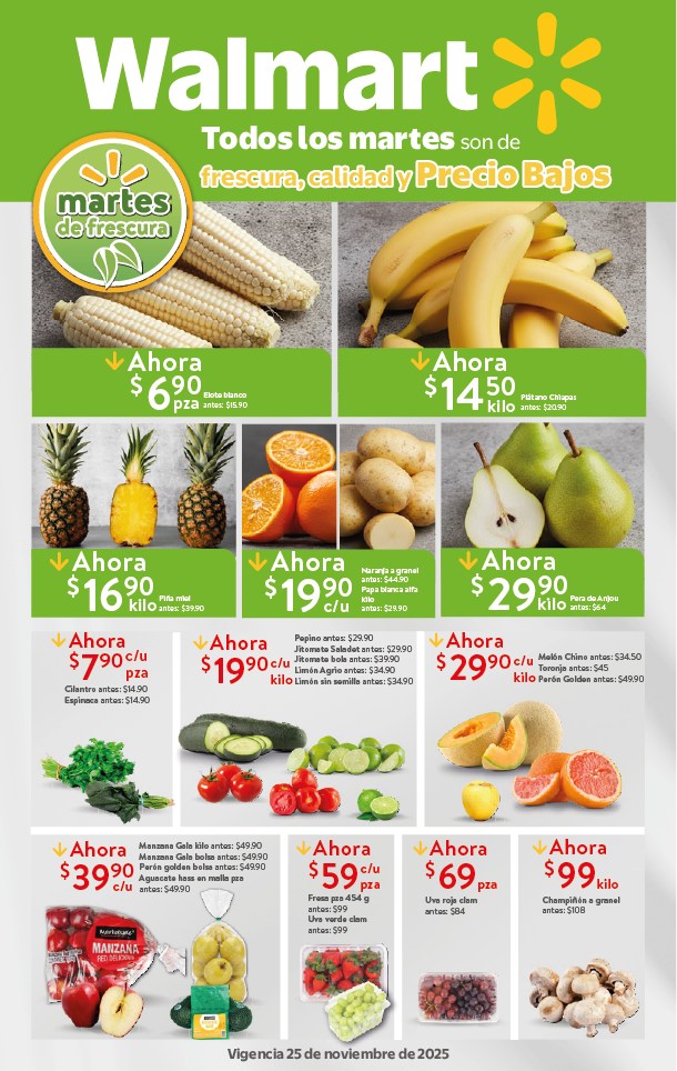 El Martes de Frescura Walmart presenta las siguientes ofertas de frutas y verduras válidas para el día martes 25 de noviembre de 2025 en tiendas Walmart y Walmart Express de la república Mexicana. Te comparto la lista completa de precios que puedes aprovechar esta semana.