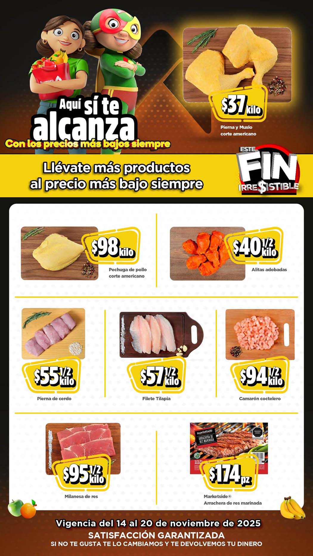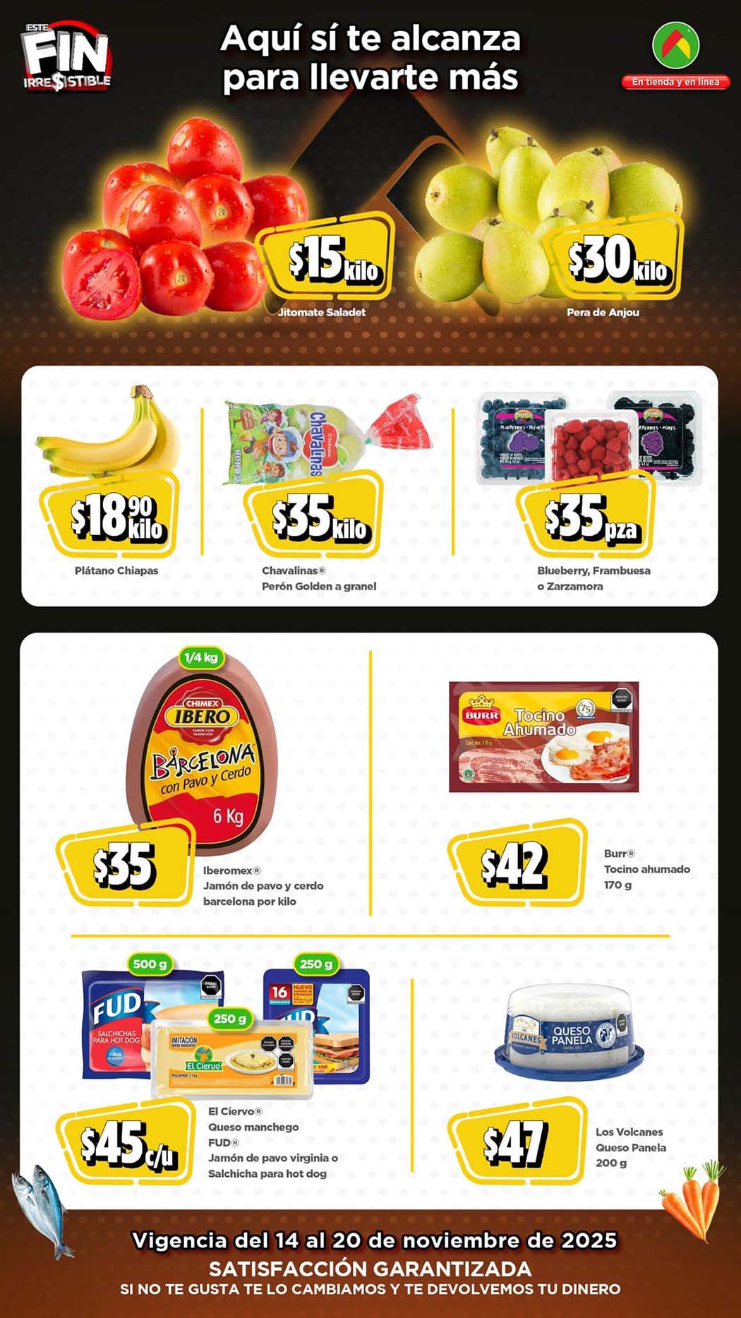 Les comparto el Folleto de Bodega Aurrerá Buen Fin Irresistible con las siguientes ofertas del Tianguis de frutas y verduras válidas del 14 al 20 de noviembre de 2025, donde encontrarás precios especiales que aplican en productos seleccionados de su tienda en línea bodegaaurrera.com.mx y en sucursales físicas.