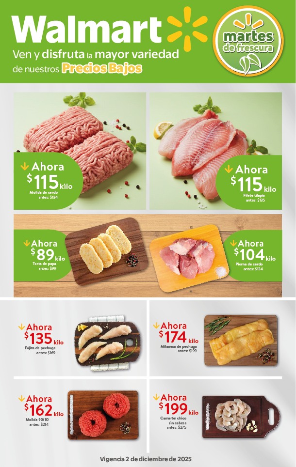 El Martes de Frescura Walmart presenta las siguientes ofertas de carnes, frutas y verduras válidas para el día martes 2 de diciembre de 2025 en tiendas Walmart y Walmart Express de la república Mexicana. Te comparto la lista completa de precios que puedes aprovechar esta semana.