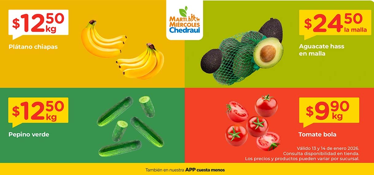 El Martimiércoles de Chedraui presenta las siguientes ofertas de frutas y verduras con precios válidos los días 13 y 14 de enero 2026 que aplican en tiendas Chedraui participantes de la República Mexicana. Les comparto la lista completa de precios para que ahorres varios pesos por tus compras de supermercado.