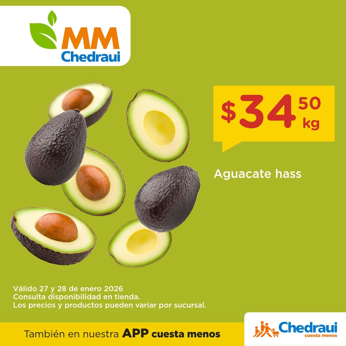 - Aguacate Hass a $34.50 el kilo.