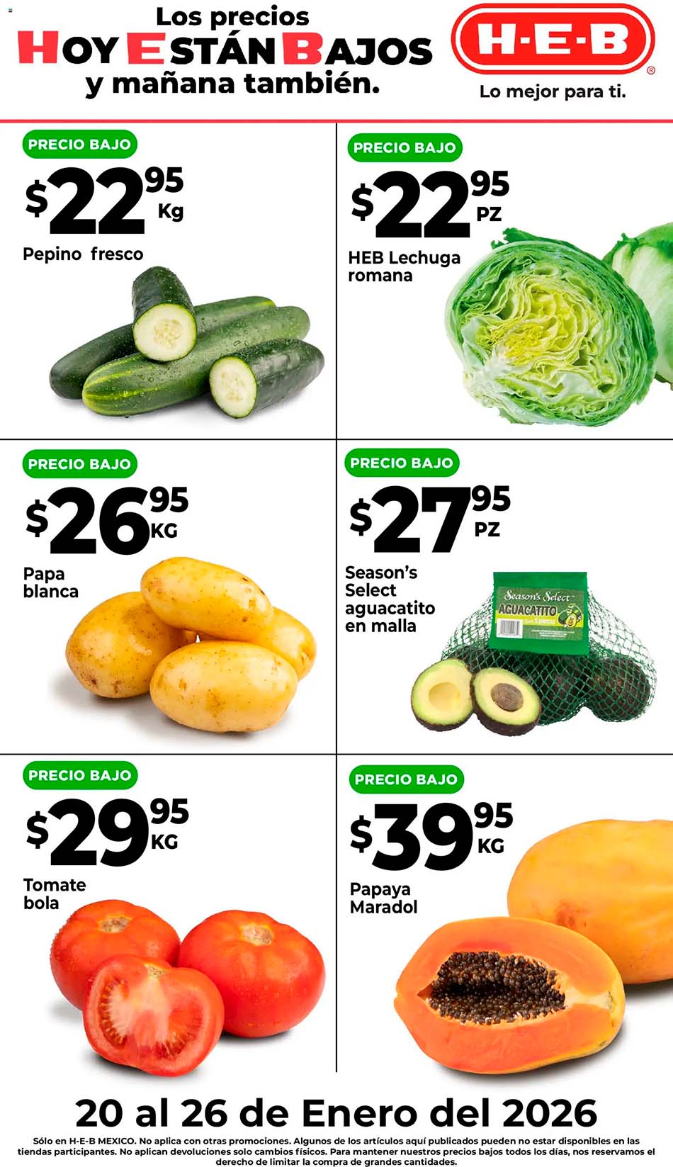 Les comparto el folleto de HEB “7 Días de Precios Bajos”, que contiene ofertas en frutas y verduras válidas este del 20 al 26 de enero 2026, en el que encontrarás precios especiales en sucursales participantes de la República Mexicana.