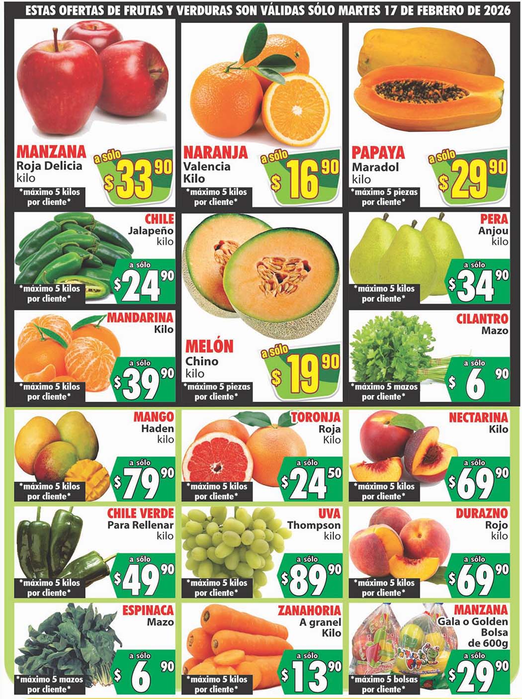 Les comparto el folleto de Casa Ley que contiene las siguientes ofertas de frutas y verduras válidas el Martes 17 y Miércoles 18 de febrero 2025, donde encontrarás precios bajos en productos seleccionados que aplican en sucursales participantes.