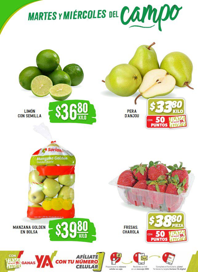 - Fresa a $38.80 la charola con 50 Puntos Soriana Ya.