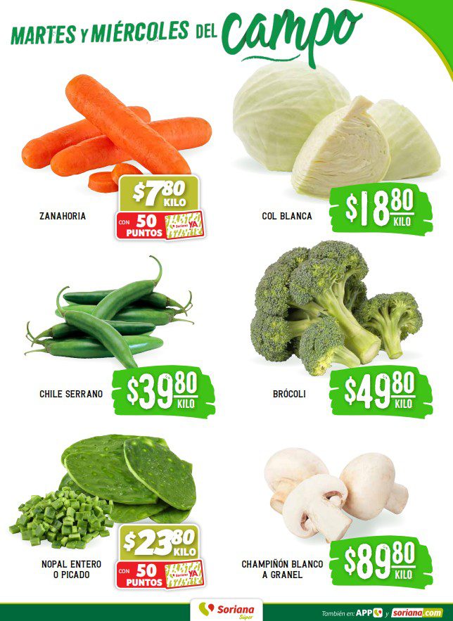 - Nopal entero o picado a $23.80 el kilo con 50 Puntos Soriana Ya.