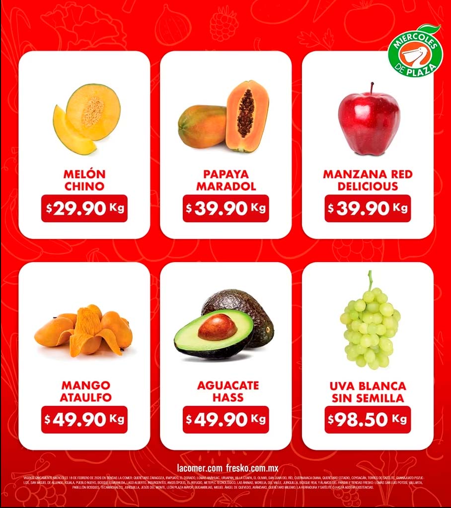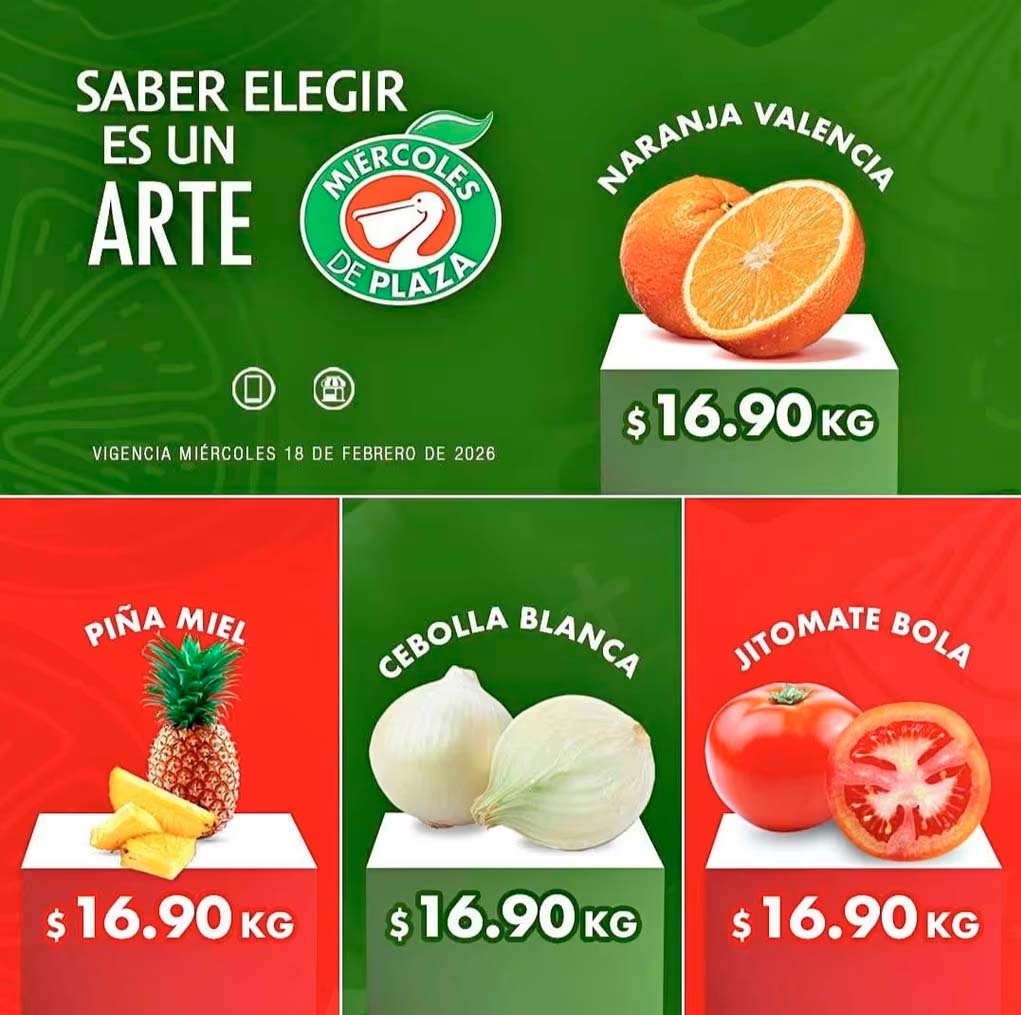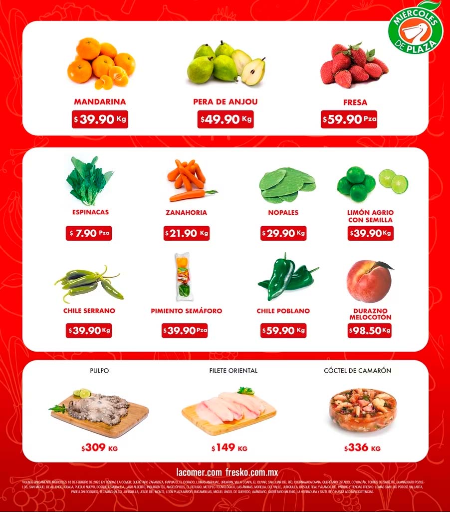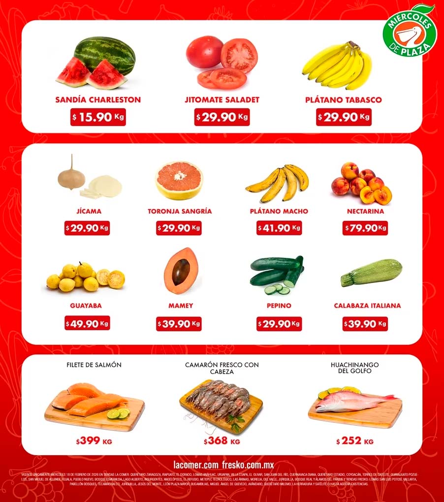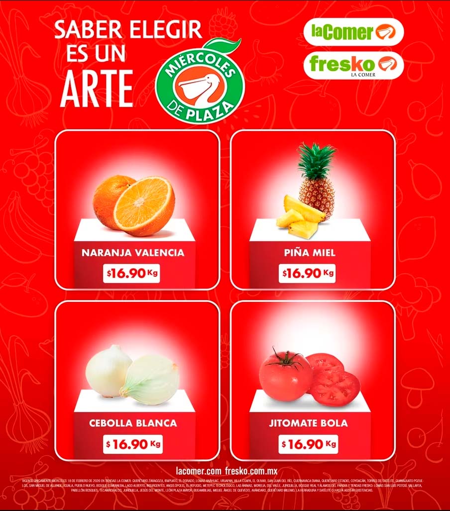El Miércoles de Plaza de La Comer presenta las siguientes ofertas de frutas y verduras válidas el día Miércoles 18 de febrero de 2026 en tiendas La Comer y Fresko de La República Mexicana. Además puedes hacer tus pedido a través de su tienda en línea lacomer.com.mx.