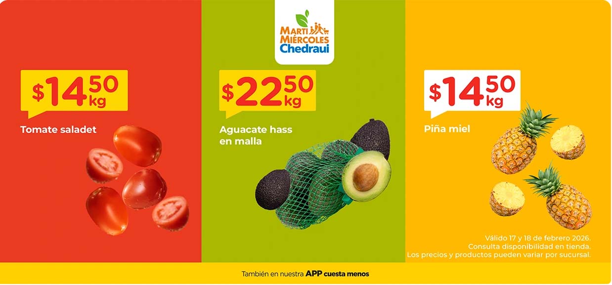 El Martimiércoles de Chedraui presenta las siguientes ofertas de frutas y verduras válidas para los días 17 y 18 de febrero 2026 que aplican en tiendas Chedraui participantes de la República Mexicana. Les comparto la lista completa de precios para que ahorres varios pesos por tus compras de supermercado.