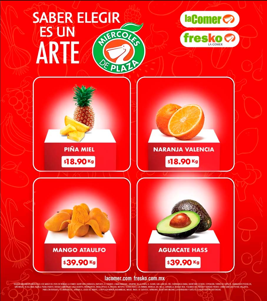 El Miércoles de Plaza de La Comer tiene preparadas las siguientes ofertas de frutas y verduras válidas para el día 4 de marzo de 2026 en tiendas La Comer y Fresko de La República Mexicana. Además puedes hacer tus pedido a través de su tienda en línea lacomer.com.mx.