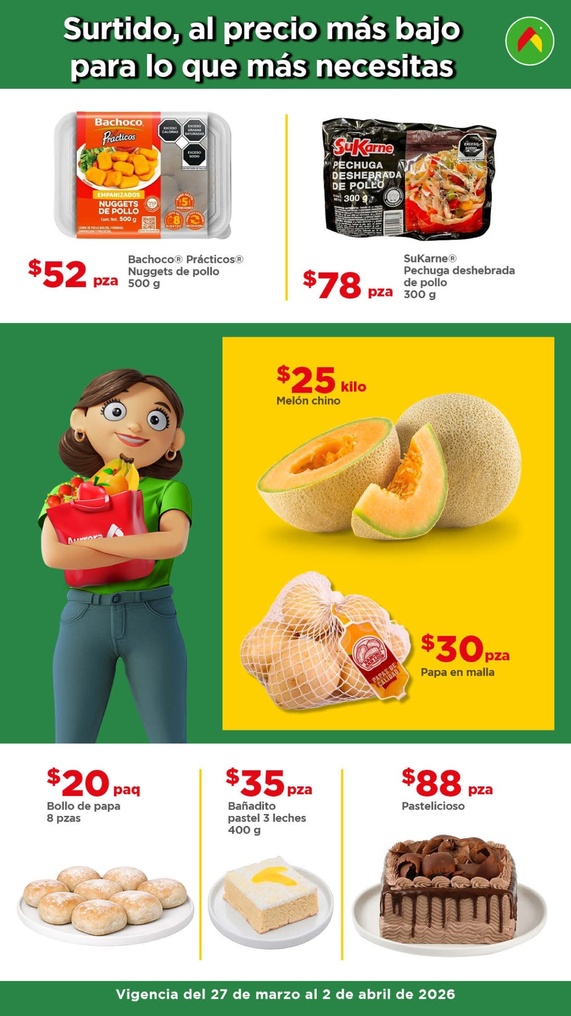 Acaba de ver el Folleto Tianguis de Mamá Lucha de Bodega Aurrera, que contiene ofertas de frutas y verduras válidas del 27 de marzo al 02 de abril de 2026, donde encontrarás precios especiales que aplican en productos seleccionados de su tienda en línea bodegaaurrera.com.mx y en sucursales físicas.