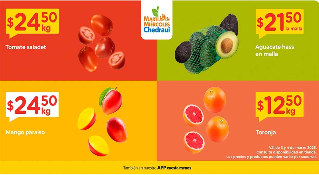 El Martimiércoles de Chedraui de frutas y verduras da a conocer las siguientes ofertas válidas para los días martes 3 y miércoles 4 de marzo de 2026 que aplican en tiendas Chedraui participantes de la República Mexicana. A continuación pueden ver la lista completa de precios para que ahorres varios pesos por tus compras de supermercado.