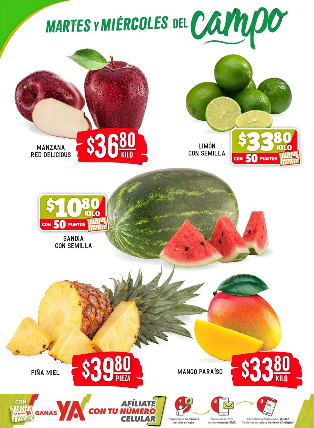- Sandía con semilla a $10.80 el kilo con 50 Puntos Soriana Ya.