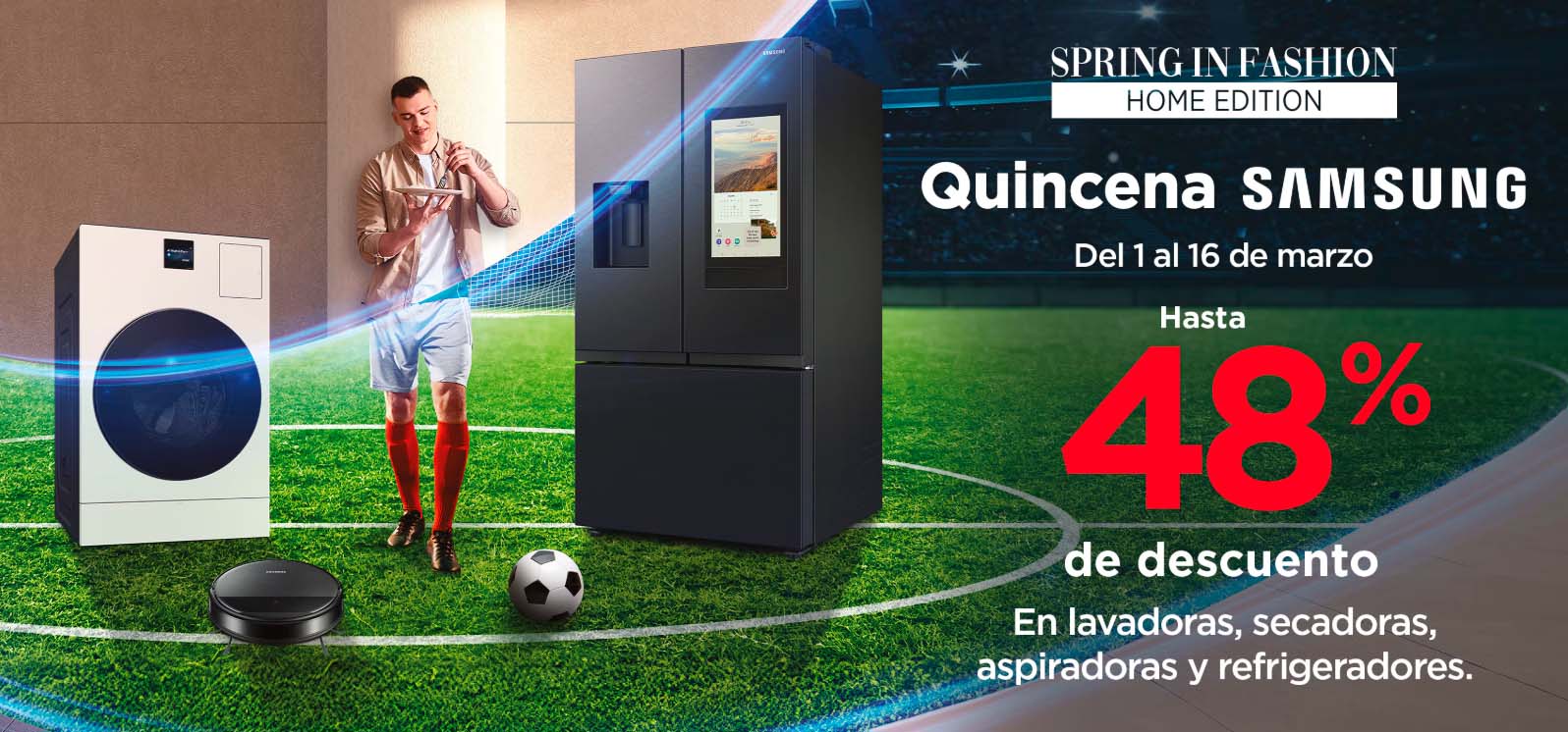 Las tiendas departamentales Sears en su promoción Quincena Samsung te ofrecen hasta un 48% de descuento en Lavadoras, secadoras, aspiradoras y refrigeradores de la marca Samsung. Estos descuentos especiales son parte de la campaña Spring in Fashion Home Edition, en al que puedes encontrar mas ofertas como esta.