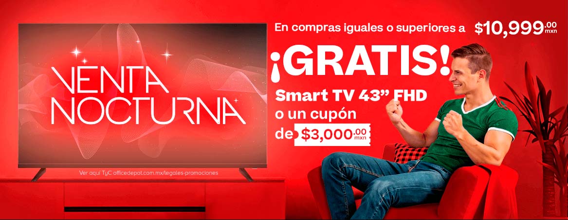 Aprovecha las Venta Nocturna de Office Depot con ofertas y promociones válidas del 3 al 5 de 2026, en la que puede obtener GRATIS una Smart TV FHD de 43’’ ó 1 cupón de $3,000.00 en compras iguales o superiores a $10,999.00, descuentos Precios especiales y hasta 18 Meses sin intereses con tarjetas participantes que aplican en productos seleccionado.