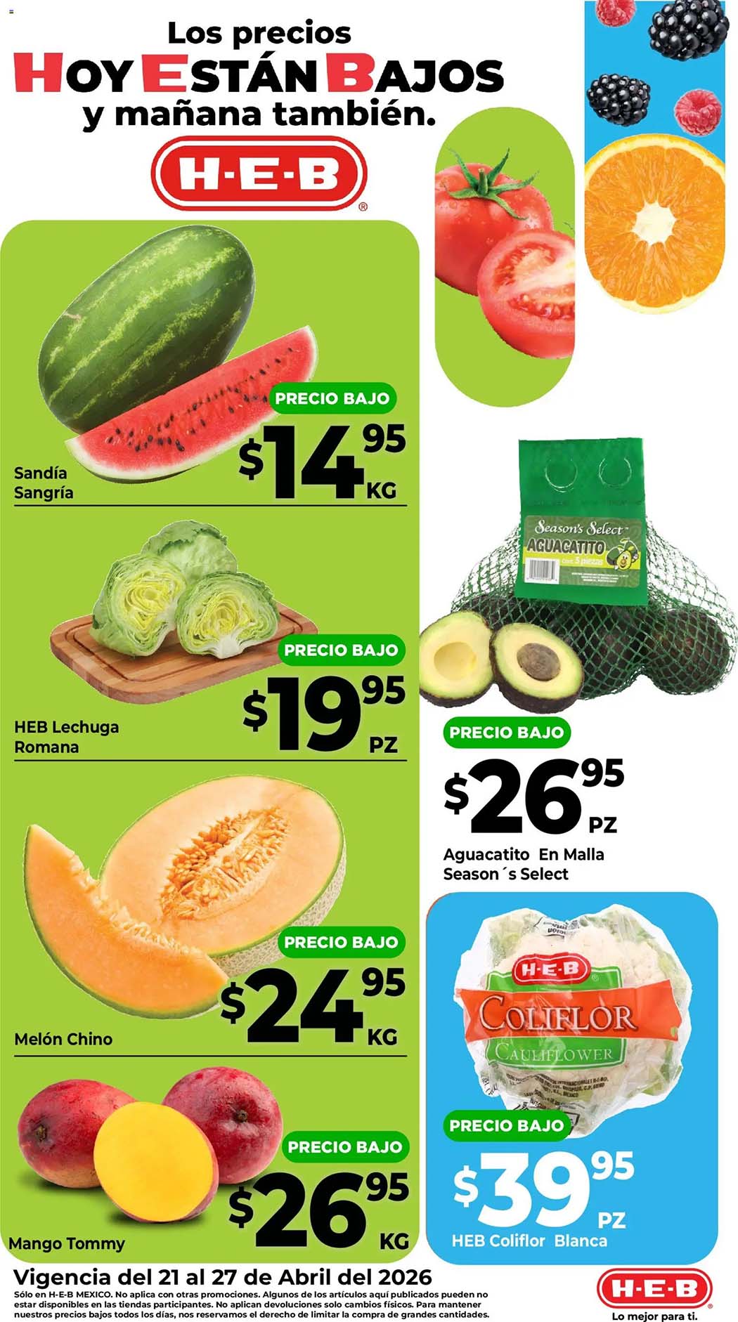 Acabo de ver el folleto 7 Días de Precios Bajos de tiendas HEB, que contiene ofertas en frutas y verduras válidas del 21 al 27 de abril de 2026, en el que encontrarás precios especiales en sucursales participantes de la República Mexicana.