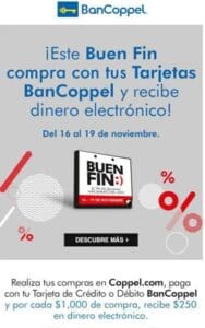Este Buen Fin 2019 tus compras con tarjetas BanCoppel en tiendas te regalan $200 de bonificación, meses sin intereses y Certificados de viaje. Promoción de Meses sin Intereses: Válido solo ...
