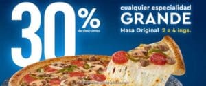 Domino's Pizza durante El Buen Fin 2018 tiene un cupón de 30% de descuento en especialidades grandes masa original de 2 a 4 ingredientes. Para hacer valida la promoción debes ...
